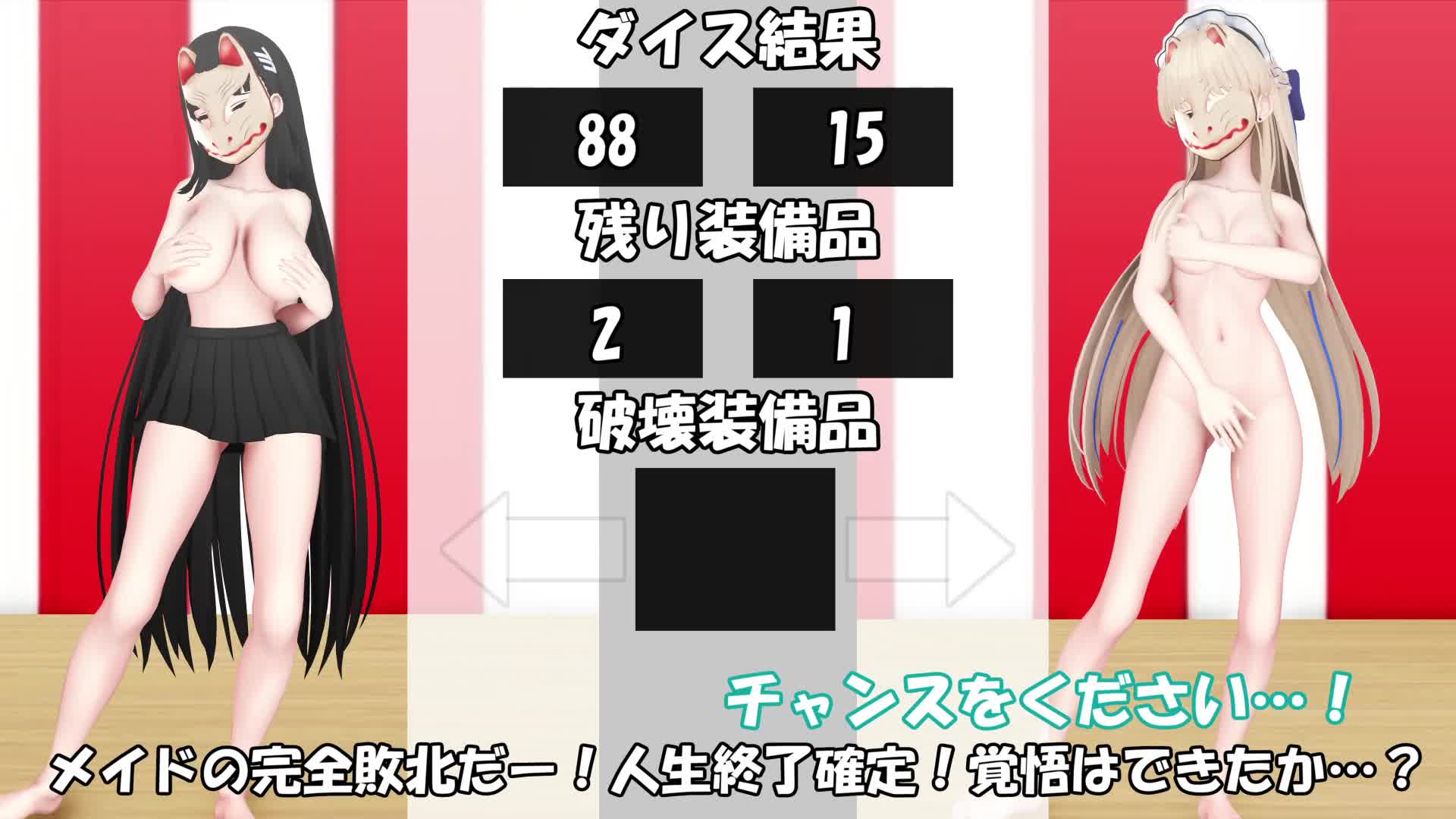 あらすじn2人でお出かけ中に怪しい広告をみつけてしまった、生徒会長とメイド。nもしかしたら、最近増えている生徒の失踪事件と関係あるかもしれない。そんなメイドの声を否定できずに調査することに決める。nもし何か危ないことがあっても私たちなら大丈夫。n実力に裏付けられた自信を胸にゲームに参加する2人。なぜどちらかが負けてしまう対戦形式のゲームになったのか?n勝負に負けたら取り返しのつかないことになるのではないか?nそもそも何故、普通に調査するのではなく、ゲームに参加しているのか?nそして、この出来事が2人の今後の人生を大きく変える判断とは、この時はまだ考えもしなかった…ルールn事前に着ている服を6種類に分け、1~99の数字がでるダイスをふってもらう。n敗者は即脱衣。どの服が脱衣かはランダムで決定するので、負けた時のお楽しみだ。nそして、勝負に6回敗北するとゲームオーバー。n以上がルールだ。n1つだけ忠告すると、ゲームオーバー時のペナルティとして、身バレ防止の仮面も没収される。nつまり、ゲームオーバーした人は、自分が誰なのかがバレたうえで全裸を全世界に公開してもらうからな。nゲームオーバーは人生終了。そう覚えておけ。n以上。お久しぶりです。前から作ってた動画が完成しました。n全部ランダムで決めたいなと思い、勝敗も、脱がせる服も全部、ランダムな数値で決定しました。n息抜きで作ったつもりだったのですが、思った以上に良い勝負内容になったので、演出を少し盛り込んでみました。nイメージはバラエティゲーム風です。n長くなりましたが、お楽しみください。また、前回の動画の募集もここで終了して、動画制作を始めてます。nどの娘がご褒美することになるのか楽しみにしててください。n今回の敗者の罰ゲームもどこかで簡単に作ろうかと思います。以上、よろしくお願いいたします。高画質差分、仮面なし差分はこちらnfantia→https://fantia.jp/posts/3544959